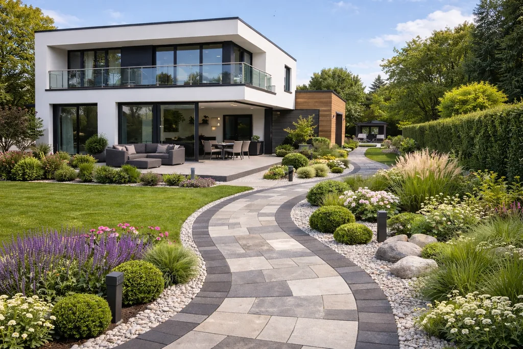 Terrassen, Einfahrten und Wege aus Naturstein oder Betonwerkstein.